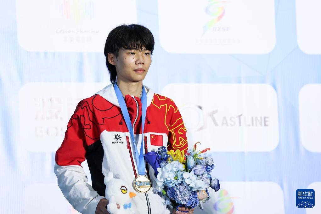 중국 스포츠클라이밍 선수 추서우훙(储守宏)이 13일 중국 구이양(贵阳)에서 열린 2025 국제스포츠클라이밍연맹(IFSC) 월드컵 스피드 남자부 결승에서 금메달을 차지했다.[촬영/신화사 기자 류쉬(刘续)]