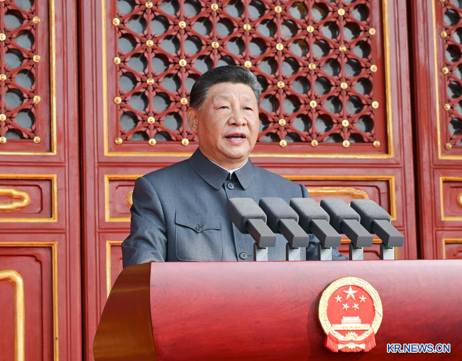 새 시대 새 여정에서 전국 각 민족 인민은 위대한 항전 정신을 계승하고 함양하며 힘차게 분발하고 용감하게 나아가며, 중국식 현대화로 강국 건설과 민족 부흥의 위업을 전면적으로 추진하기 위해 단결하며 분투해야 한다!